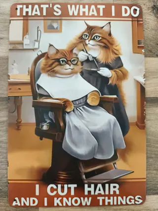Placa decorativa em metal resistente, estilo vintage, com ilustração divertida de gatos num salão de cabeleireiro / barbearia — perfeita para dar personalidade à decoração. Ideal para: ✔️ Sala ✔️ Escritório ✔️ Bar / café ✔️ Quarto ✔️ Presentes criativos ✨ Material em metal (não é madeira nem plástico) ✨ Estilo retro moderno ✨ Design humorístico e original ✨ Fácil de pendurar 📏 Medidas: 20 x 30 cm 📦 Artigo novo 📸 Fotos reais do artigo 👉 Preço ajustado para venda rápida 👉 Envio rápido 👉 Aceito propostas razoáveis