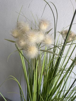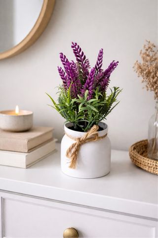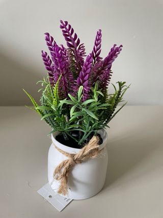 Este vaso traz uma linda flor de lavanda artificial para decorar o seu espaço. O vaso é branco e tem um detalhe de corda de juta. - Flor de lavanda artificial. 21 cm altura - Vaso branco com detalhe em juta.