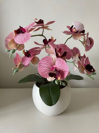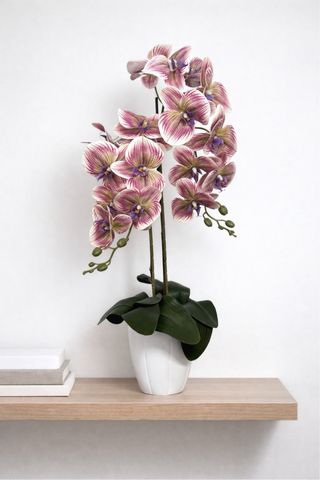 Linda orquídea artificial em vaso branco em ceramica. 36 cm altura - Flores em tons de rosa com detalhes. - Folhagem verde realista. - Vaso com design moderno.