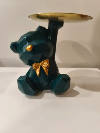 Peça decorativa moderna em formato de urso geométrico com bandeja dourada superior. Ideal para guardar chaves, moedas, joias ou pequenos objetos, ao mesmo tempo que decora qualquer espaço. Design elegante com acabamento verde escuro e detalhes dourados. Estado: Novo Decoração Premium. Função decorativa e utilitária Uma peça diferente que destaca qualquer entrada ou móvel.