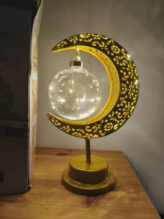 Candeeiro decorativo em formato de lua dourada com esfera de vidro suspensa iluminada por luz LED quente, criando um ambiente acolhedor e sofisticado. Ideal para decoração de salas, quartos, mesas de apoio, escritórios ou como peça de destaque em ambientes modernos e elegantes. ✨ Design moderno e elegante ✨ Estrutura em tom dourado premium ✨ Luz quente suave (ambiente aconchegante) ✨ Perfeita como luz decorativa ou de presença ✨ Nova, nunca utilizada 📏 Altura aproximada: 30 cm 📦 Estado: Novo com caixa Uma peça de decoração que transforma qualquer espaço! Artigo NOVO! Envio Rápido e Muito Bem embalado.