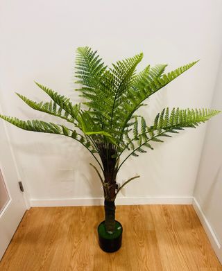 Planta artificial decorativa com um aspeto natural e elegante. Perfeita para adicionar um toque de verde a qualquer espaço. - Altura considerável, ideal para cantos ou salas. - Vaso preto incluído, pronto a expor. - Folhagem densa e realista. - 83cm altura
