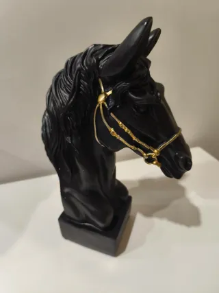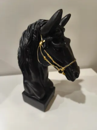 Escultura decorativa em formato de cabeça de cavalo, ideal para ambientes modernos e sofisticados. Peça elegante em tom preto com detalhes dourados, perfeita para dar um toque de requinte à sua sala, escritório ou estante. ✔️ Altura: cerca de 29 cm ✔️ Cor: Preto com detalhes dourados ✔️ Estado: Novo ✔️ Ideal para decoração de interiores Excelente opção para quem procura uma decoração distinta e elegante. Preto e Dourado. Artigo Novo de Excelente Qualidade - Premium!
