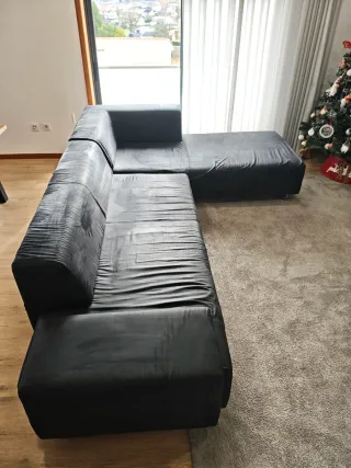 Sofá em tecido fresco preto com chaise longue, ideal para a sua sala de estar. O seu design moderno adapta-se a qualquer espaço. Chaise longue no lado direito. Sofá com chaise longue em bom estado de conservação. Peça versátil e confortável que pode ser usada em diferentes ambientes da sua casa. Ideal para quem procura um móvel funcional e de qualidade. Marca: Aquinos; Largura: 3,10m; Comprimento: 2,05m Altura: 0,73m Profundidade: 0,70m Chaise longue: 1,95 m - 0,95 m