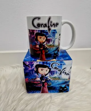 Caneca com estampa temática do filme Coraline. Perfeita para fãs da animação. - Design exclusivo com Coraline e o gato preto. - Imagem vibrante e detalhada. - Ideal para colecionadores.