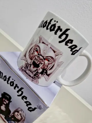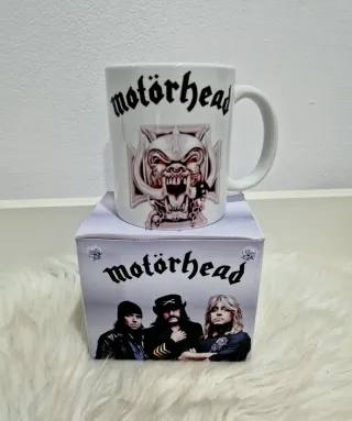 Caneca com a estampa da banda Motorhead. - Estampa frontal com o logo Snaggletooth da banda. - Imagem da banda na base da caneca.