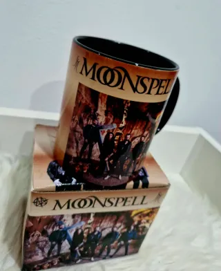 Caneca com a arte da banda Moonspell. - Design exclusivo da banda. - Ideal para fãs de música. - Peça de cerâmica com acabamento em preto e marrom.