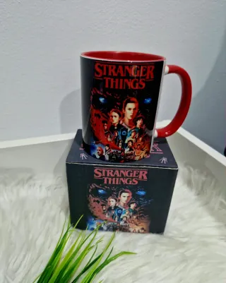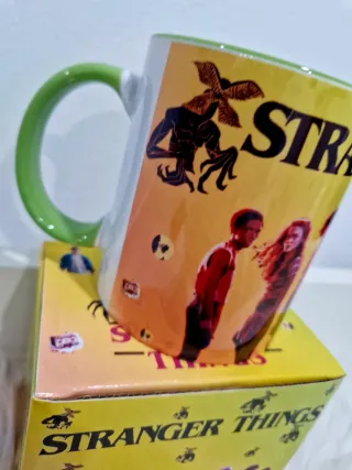 Caneca temática da série Stranger Things, com design vibrante e colorido. - Estampa com personagens e logo da série. - Ideal para colecionadores e fãs.