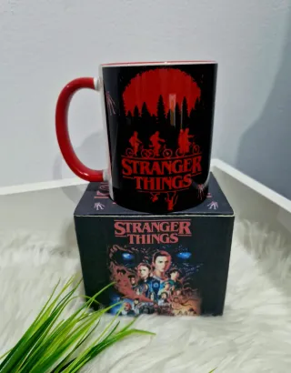 Caneca com estampa da série Stranger Things. Perfeita para fãs da série. - Design temático da Stranger Things. - Interior e alça na cor vermelha.