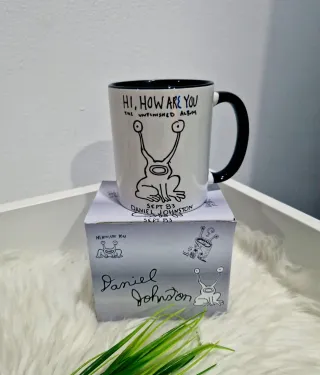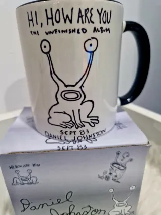 Caneca com a arte icônica do álbum Hi, How Are You de Daniel Johnston. - Design exclusivo. - Detalhes do álbum The Unfinished Album e Sept 83.