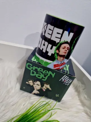 Caneca com design inspirado na banda Green Day. - Estampa da banda. - Detalhes em verde e preto.