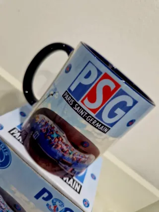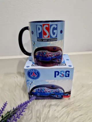 Caneca com o emblema do Paris Saint-Germain. - Design com o logo PSG. - Imagem do estádio e adeptos.