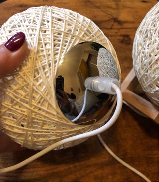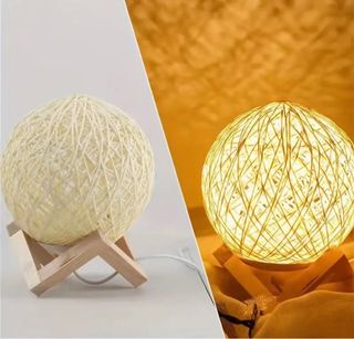 Conjunto de candeeiros de mesa com um design único e elegante. - Abajur esférico em vime entrelaçado. - Base em madeira com um acabamento natural.