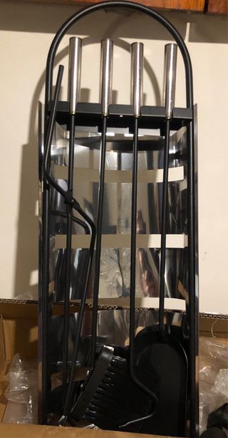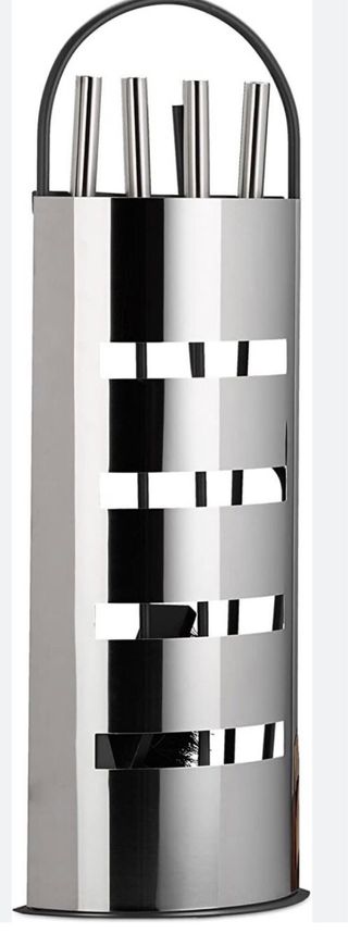 Conjunto de acessórios para lareira em aço inoxidável com acabamento polido. - Design moderno com alça preta. - Inclui suporte para ferramentas. - Detalhes vazados no corpo do suporte.