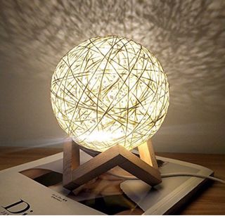 Conjunto de candeeiros com base em madeira e abajur em vime. - Design esférico. - Iluminação ambiente.