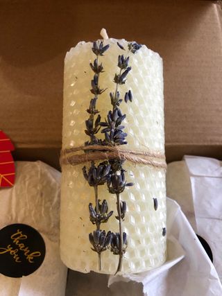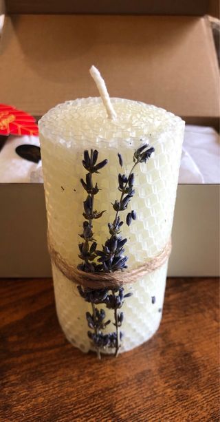 Conjunto de velas artesanais em cera de abelha, decoradas com flores de lavanda secas. - Cera de abelha natural. - Decoração com ramos de lavanda. - Acabamento texturizado em favo de mel. - Amarradas com corda de juta.