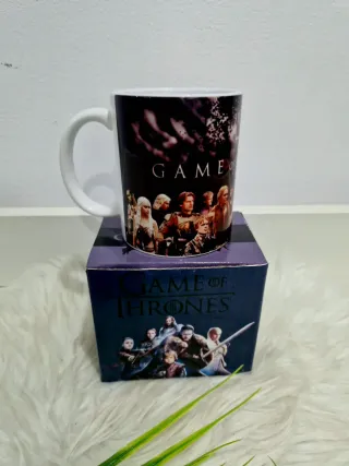 Caneca temática da série Game of Thrones. Perfeita para fãs da saga. - Design com personagens e espada. - Estampa vibrante e detalhada.