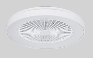 Candeeiro de teto moderno com iluminação LED e ventoinha integrada. Uma peça funcional e elegante para qualquer divisão. - Design circular contemporâneo. - Acabamento em branco.