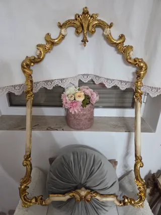 Peça decorativa em formato de cornucópia com acabamento em folha de ouro e detalhes em bege. - Design ornamentado com elementos clássicos. - Estrutura robusta.