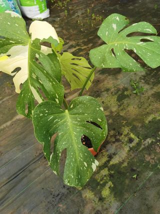 Linda planta Monstera Thai variegata com folhas únicas e vibrantes. Perfeita para colecionadores e amantes de plantas. - Folhagem com variegacão verde e branca. - Planta saudável e bem cuidada.