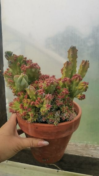 Cacto cristata com um crescimento exuberante e cores vibrantes. Vaso não incluído para não pesar os portes Enviado sem terra - Planta de porte grande. - Apresenta coloração avermelhada nas pontas. - Formato único e escultural.