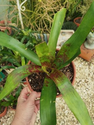 Linda planta de bromelia, ideal para decorar cualquier espacio. - Hojas verdes con tonos rojizos y manchas. - Centro oscuro y llamativo.