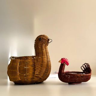 Conjunto de dos cestas decorativas con forma de gallina. Pareja de cestas de mimbre con forma de gallinas, una grande y otra pequeña. Perfectas para decoración rústica o para guardar huevos, pan o frutas. Muy originales y en buen estado. - Cesta grande con pico metálico. - Cesta pequeña con cresta roja.