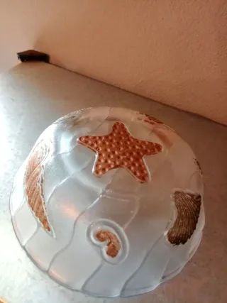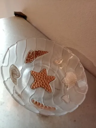 Tigela de vidro com um design texturado e decorada com motivos marinhos. - Desenhos de conchas e estrela-do-mar. - Acabamento translúcido.