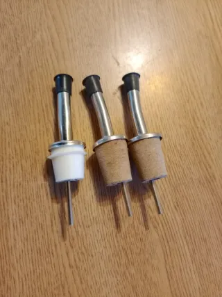 Conjunto de três doseadores para bebidas, ideais para controlar a quantidade servida. - Um doseador com acabamento em plástico branco. - Dois doseadores com acabamento em cortiça. - Componentes metálicos e de borracha.