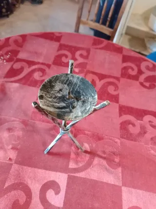 Suporte de vela com um design rústico e artesanal. Perfeito para adicionar um toque de charme a qualquer ambiente. - Estrutura em metal com acabamento envelhecido. - Três pernas para estabilidade. - Bandeja para a vela.