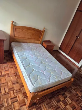 Conjunto de móveis para quarto, incluindo cama de corpo e meio, colchão ortopédico e mesa de cabeceira com gavetas. Transporte por conta do comprador. Pagamento no ato de entrega. O valor poderá ser ligeiramente negociável. Qualquer questão poderei esclarecer por mensagem!