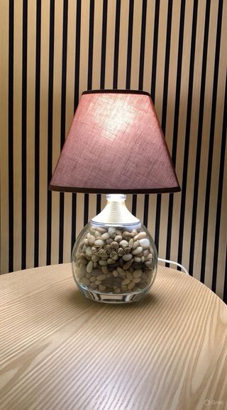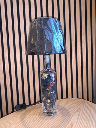 Lámpara de mesa decorativa creada a partir de una botella reciclada. Un toque único y artesanal para tu hogar. - Base de vidrio con relleno decorativo. - Pantalla de tela negra.