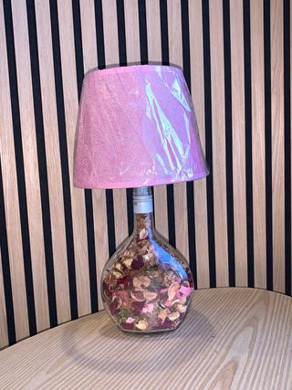 Lámpara de mesa decorativa creada a partir de una botella de vino. - Base de botella de vidrio transparente. - Pantalla de tela rosa. - Relleno decorativo de flores secas y pétalos.