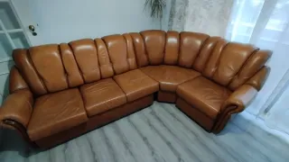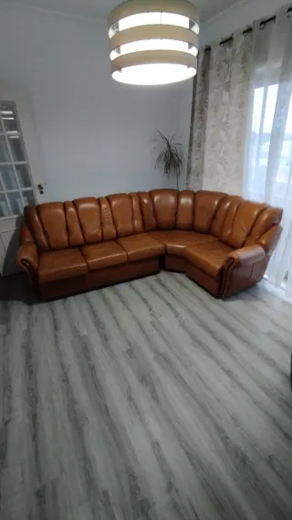 Sofá em couro com um design moderno e confortável. - Acabamento em couro de alta qualidade. - Cor castanha versátil. - Estrutura robusta e durável.