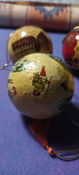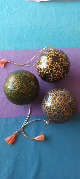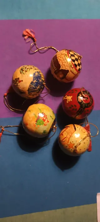 NOVO PREÇO-ÚLTIMA OPORTUNIDADE Conjunto de cinco bolas decorativas feitas de papel mache,super originais, divertidas e únicas. Parte de um projecto de e para jovens em Srinagar,Índia. Seguramente não encontrará outras iguais:-) -Só este conjunto. - Design artesanal com detalhes pintados à mão. - Cada bola possui um fio dourado para pendurar.
