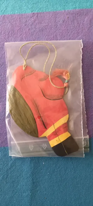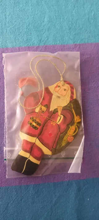 Decoração de Natal em madeira, com detalhes em dourado e vermelho. Feito e pintado artesanalmente. - Ornamento temático do Pai Natal. - Ideal para pendurar na árvore de Natal.