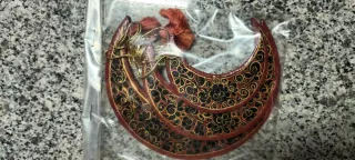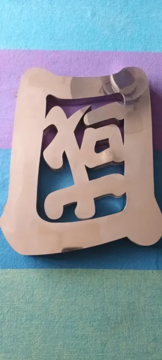 Decoração em aço inoxidável com caracteres orientais (3 peças) - Design moderno e elegante. - Acabamento polido. - Com suportes para pendurar. - Foto 1; 32cm. X 27,5cn. - Foto 2; 35cm. X 25,5cm - Foto 3; 39cm. X 16cm. -Foto 4; é uma parte de um dos 3 caracteres, mas não sei de qual.