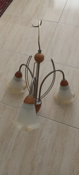 Conjunto de quatro candeeiros de teto com um design elegante. Óptima oportunidade, excelente preço para os 4 candeeiros. - Estrutura em metal com detalhes em madeira. - Cúpulas em vidro opaco. - O candeeiro da foto número 5 é de 4 lâmpadas. IMPORTANTE- Só podem ser entregues em mão devido às dimensões e peso. Podem ser levantados na minha morada ou posso entregar entre Ovar e Porto.