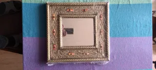 Espelho decorativo com inspiração marroquina. A moldura apresenta um design intrincado com detalhes em relevo e aplicações em tons de laranja. 40 x 38cm. - Moldura em metal - Detalhes decorativos em relevo. - Aplicações em tom laranja.