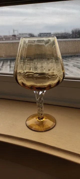 Este balão de vidro vintage em tom âmbar adiciona um toque de elegância a qualquer ambiente. A haste torcida confere um detalhe único e charmoso. - Design clássico com um toque moderno. - Acabamento texturizado no copo. Tem 20cm. de altura.