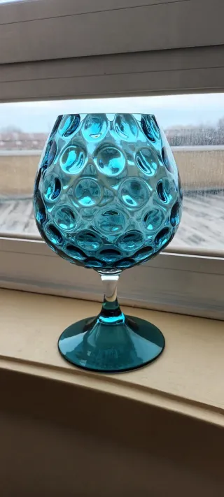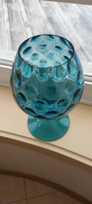 Peça de vidro com um design único e cor vibrante. Lindo, original e muito grande, este balão Vintage em vidro é uma peça de decoração única. Tem 26cm. de altura. - Design com relevo de bolhas. - Base e haste em vidro. - Tom azul-petróleo.