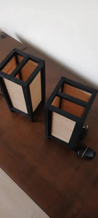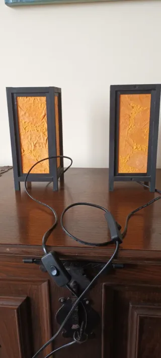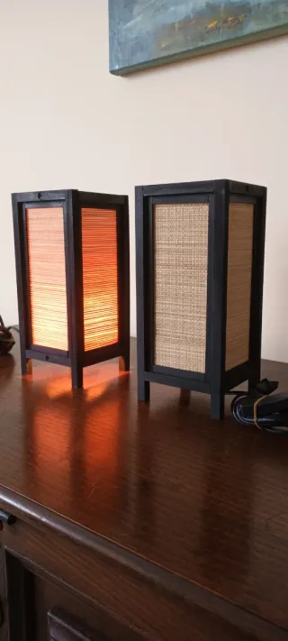 NOVO PREÇO Um par de candeeiros japoneses, ideais para mesa de cabeceira ou como decoração em qualquer parte da casa. Feitos de madeira muito leve e painéis laterais de bambu Lindos, originais e super Zen. Importados directamente do Japão. 28cm. de altura e 12,5cm. de largura e profundidade.