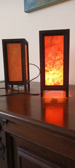 NOVO PREÇO Um par de candeeiros japoneses, ideais para mesa de cabeceira ou como decoração em qualquer parte da casa. Feitos de madeira muito leve e painéis laterais de papel japonês com folhas naturais. Lindos, originais e super Zen. Importados directamente do Japão. Altura 28cm. e 12,5cm. de largura e profundidade.