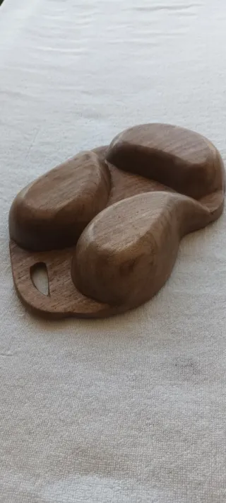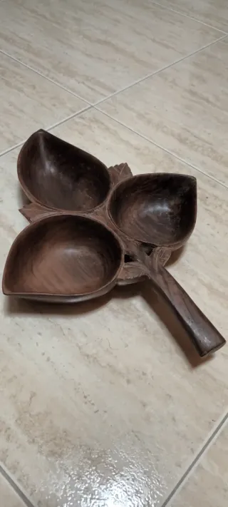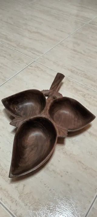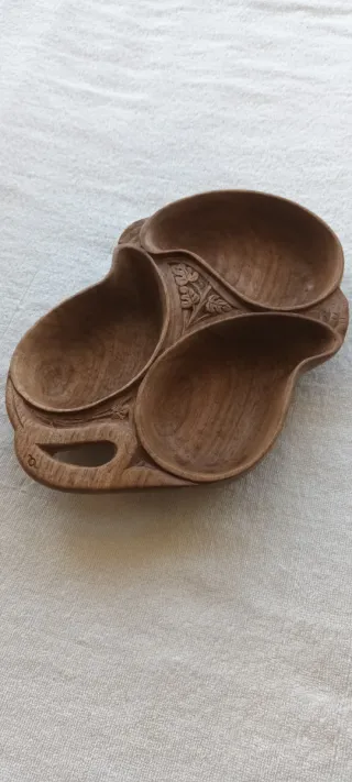 Linda taça/recipiente em madeira de qualidade, feito manualmente, com 3 divisões. Mede 35cm. de comprimento por 26cm. de largura. Prático, mas super bonito e decorativo.