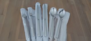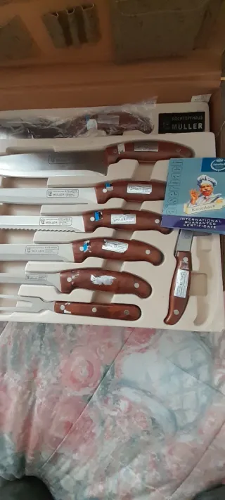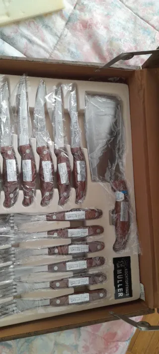 Conjunto de utensílios de cozinha da marca alemã Müller. Inclui facas e garfos com cabos em madeira. - Facas com lâminas em aço inoxidável. - Cabos em madeira com rebites. - Inclui um cutelo. - Talheres embalados individualmente.
