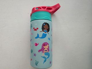Garrafa de água com um divertido design de sereias e elementos marinhos. Perfeita para levar para a escola ou passeios. - Capacidade de 350ml. - Tampa com bico e pega. - Padrão colorido com sereias e vida marinha.