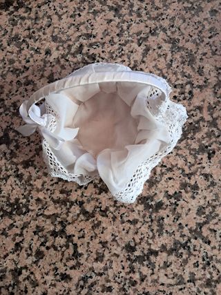 Cesta delicada para alianças, com acabamento em renda. - Detalhes em renda na borda. - Laço de cetim para fechar.