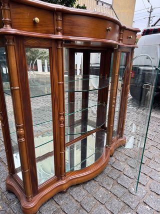 Vitrina em madeira com acabamento polido e painéis de vidro. Frente e laterais curvas, com 3 gavetas superiores e prateleiras em vidro. Ideal para exposição de peças decorativas, louças ou coleções. Estrutura sólida e bem conservada, com excelente presença.