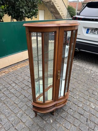 Vitrina vintage em madeira com painéis de vidro curvos na frente e nas laterais. Design clássico com pés curtos e detalhes ornamentados na base. Porta frontal em vidro. Interior com prateleiras em vidro, ideal para exposição de peças decorativas, coleções ou louças finas. Gaveta inferior. Estrutura sólida e bem conservada, com excelente presença estética. Único defeito a apontar é na parte superior que tem uma marca queimada.