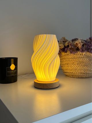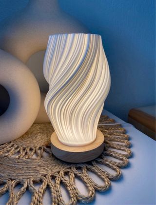 Lâmpada de mesa com um design moderno e escultural, inspirada no estilo Japandi. A sua forma única em espiral cria um efeito visual interessante. - Base em madeira. - Acabamento em plástico com textura. - Iluminação quente e acolhedora.